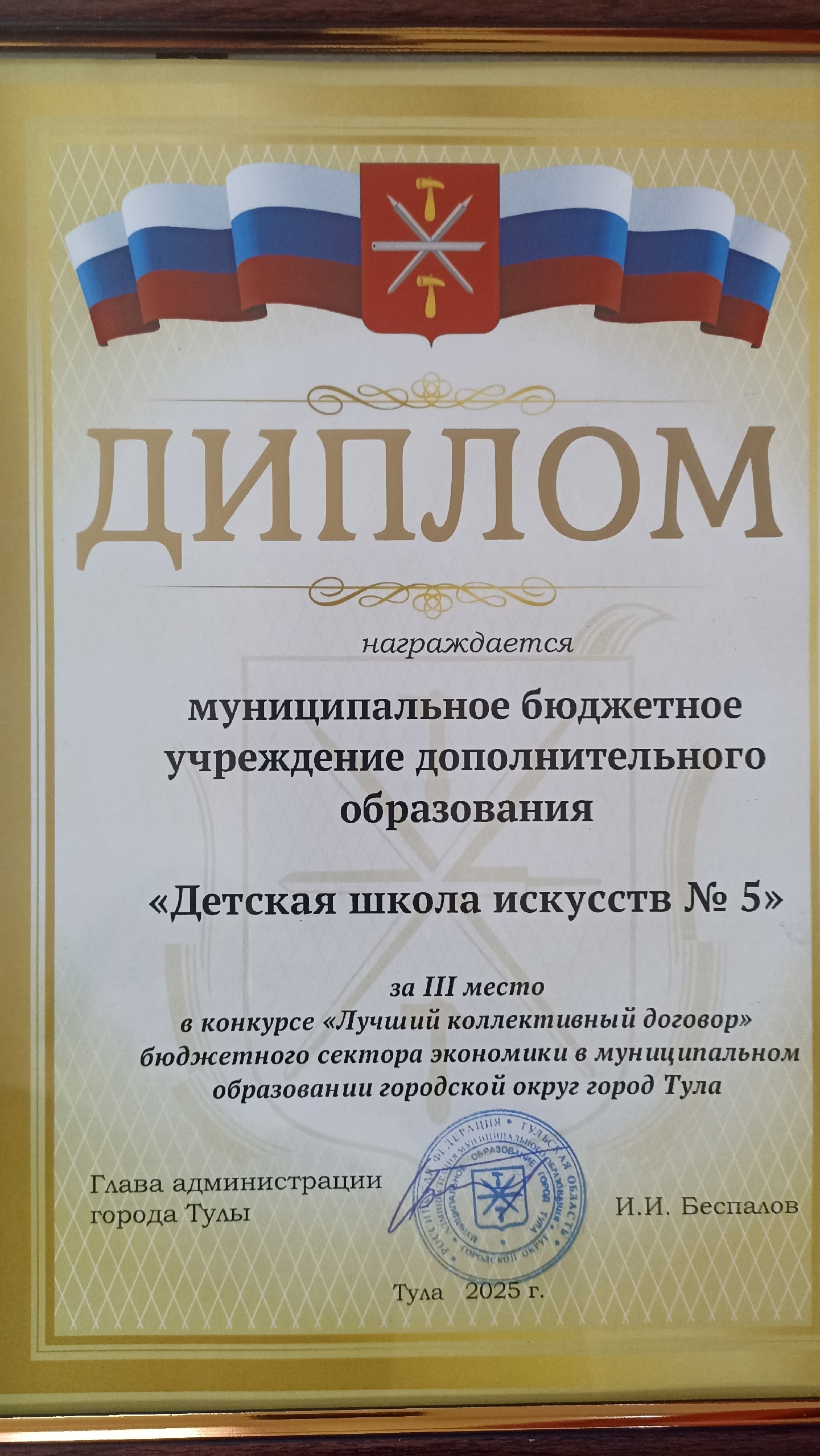 В Туле наградили победителей конкурса, который прошел среди организаций и учреждений муниципального образования городской округ город Тула на «Лучший коллективный договор» по итогам 2024 года. Среди бюджетного сектора экономики Коллективный договор нашей школы был отмечен Дипломом за III место.