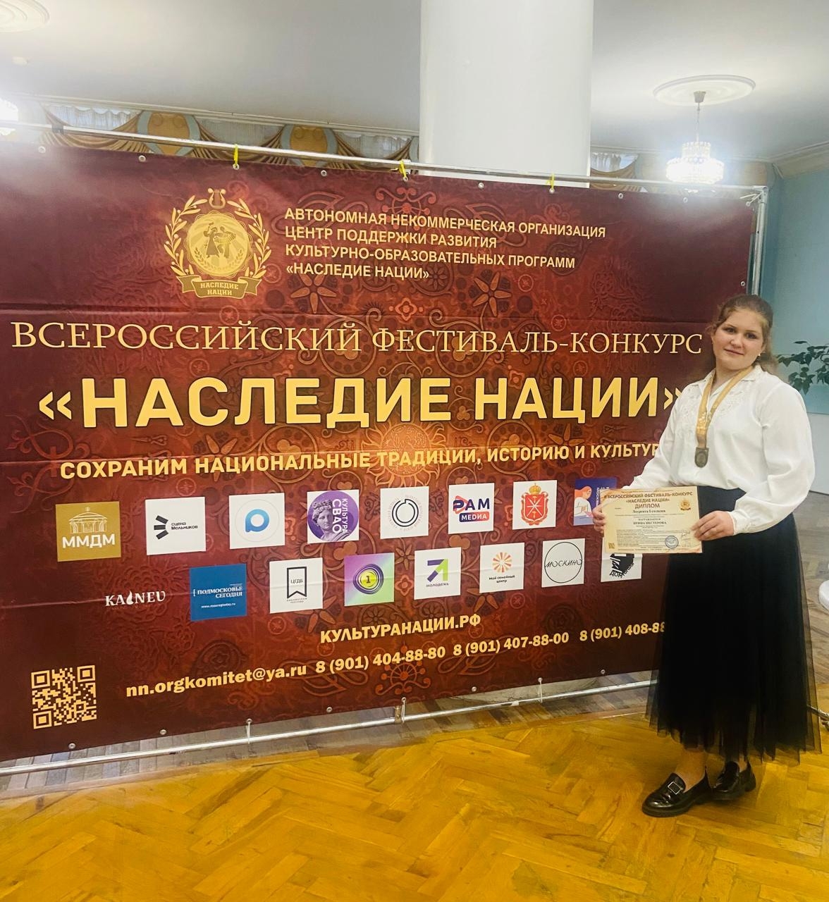 Поздравляем Нестерову Ирину (класс преподавателя Барановской И.В.) - Лауреата I степени регионального отборочного этапа II Всероссийского конкурса "НАСЛЕДИЕ НАЦИИ"!